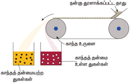 முறை: நன்கு தூளாக்கப்பட்ட தாதுவானது இரண்டு உலோக உருளைகளுக்கு ஊடே செல்லும் இயங்கு பெல்டின் மூலம் கொட்டப்படுகின்றது. இவ் உருளைகளில் ஒன்று காந்தத் தன்மையுடன் இருப்பதால், காந்தத் துகள்கள், காந்த தன்மையுள்ள உருளையால் ஈர்க்கப்பட்டு காந்த தன்மையற்ற துகள்கள் தொலைவில் செறிந்து பிரிக்கப்படும்.