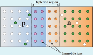 - But, in a p-n junction, when the electrons and holes move to the other side of the junction, they leave behind exposed charges on dopant atom sites, which are fixed in the crystal lattice and are unable to move.