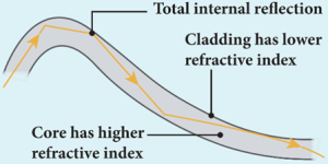 - When a signal in the form of light is directed at one end of the fibre at a suitable angle, it undergoes repeated total internal reflection along the length of the fibre and finally comes out at the other end.