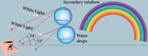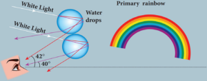- Primary rainbow is formed when light entering the drop undergoes one total internal reflection inside the drop before coming out from the drop as shown in figure.