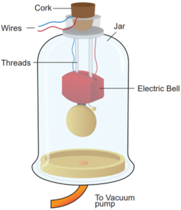 • An electric bell and an airtight glass jar are taken. The electric bell is suspended inside the airtight jar.