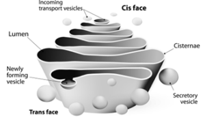 Golgi apparatus is a stack of flat membrane enclosed sacs. It consist of cisternae, tubules, vesicles and Golgi vacuoles. In plants, the cisternae are 10-20 in number placed in piles separated from each other by a thin layer of inter cisternal cytoplasm often flat or curved. Peripheral edge of cisternae forms a network of tubules and vesicles. Tubules interconnect cisternae and are 30-50nm in dimension. Vesicles are large round or concave sac. They are pinched off from the tubules.They are smooth/ secretary or coated type. Golgi vacuoles are large spherical structures filled with granular or amorphous substance, some function like lysosomes. Golgi apparatus compartmentalises a series of steps leading to the production of functional protein.