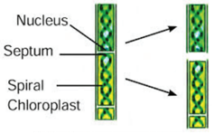 - Fragmentation: In filamentous algae, breaking of the filament into many fragments is called fragmentation. Each fragment having atleast one cell, may give rise to a new filament of the algae by cell division e.g. Spirogyra.