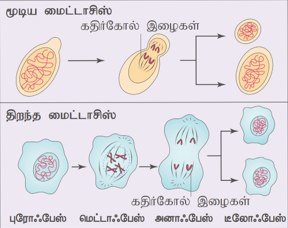 மூடிய மைட்டாசிஸ்: உட்கரு உறை சிதையாமல் குரோமோசோம்கள் எதிரெதிர் துருவங்களை நோக்கிச் செல்கின்றன. எடுத்துக்காட்டு: பல ஒற்றைச் செல் யூகேரியோட்டுகளான ஈஸ்ட் மற்றும் சளிப் பூஞ்சைகள்.