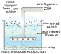 முறை: நன்கு தூளாக்கப்பட்ட தாதுவானது, எண்ணெயும், நீரும் கொண்ட ஒரு பெரிய தொட்டியில் இடப்பட்டு, அவற்றின் மேல் நன்கு அழுத்தப்பட்ட காற்று செலுத்தப்படுகின்றது. தாதுவானது எண்ணெயின் மூலம் ஈரப்படுத்தப்பட்டு நுரைவடிவில், தாதுக்கூளத்திலிருந்து பிரிக்கப்படுகின்றது. தாதுவானது லேசாக உள்ளதால் அது நுரைவடிவில் வெளிப்பரப்பிற்கு வந்துவிடும், மாசுக்கள் அடியில் தங்கிவிடும். எ.கா ஜிங்க் ப்ளன்ட் (ZnS).