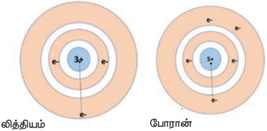 மாறாக தொடரில் இடது புறத்திலிருந்து வலதுபுறமாக செல்கையில், ஆற்றல் மட்டம் மாறுவதில்லை. ஆனால் புரோட்டானின் எண்ணிக்கை அதிகரித்து செல்லும். அதிகரிக்கும் நேர்மின் சுமைக்கு ஏற்ப எலக்ட்ரான்கள் மீதுள்ள கவர்ச்சி விசை அதிகரிப்பதால் அணுவின் உருவஅளவு குறைகிறது.