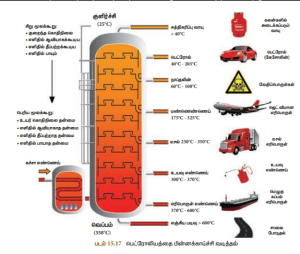- எண்ணெய் வடிகட்டுதல் செயல்முறை மூலம் பல்வேறு கூறுகளாக பிரிக்கப்படும். கனமான கூறுகள் கீழே நிலைபெற்றிருக்கும் அதேசமயம் இலகுவான கூறுகள் நீராவியாக உயர்கின்றன அல்லது திரவமாக இருக்கும்.